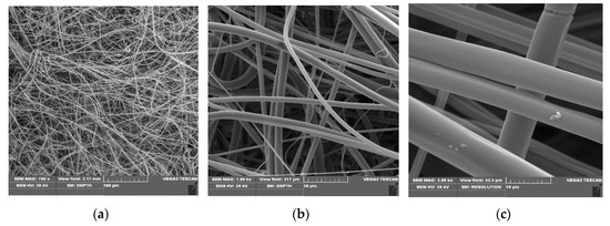 Scanning electron microscopy (SEM) images of poly(lactide) (PLA) non-woven, magnification: (a) 100×, (b) 1000×, (c) 5000×.