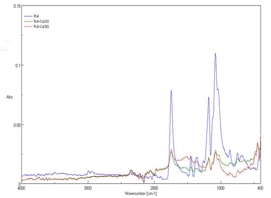 The spectra of PLA–Cu0(t) offered noticeable differences, mainly at wavelength 1620 cm−1 (absorbances 0.00 (PLA), 0.013 (PLA–Cu0(10) and 0.021 (PLA–Cu0(30)). Also at 500–400 cm−1 absorbances derived from PLA–Cu0(t)composites are higher than for starting PLA. These differences can presumably have resulted from copper’s presence in the PLA and are similar to those obtained by Diaz-Visurraga et al. in a FTIR study of alginate-stabilized copper nanoparticles. [71]