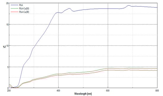 Transmittance spectra [%T] of PLA samples and PLA–Cu0(t) hybrids (PLA–Cu0(10) or PLA–Cu0(30)), recorded in the ranges λ = 200–800 nm is presented in Figure 5.