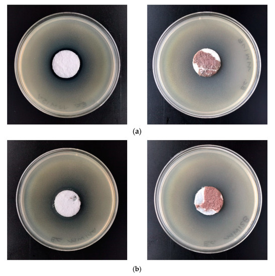Inhibition zones of bacterial growth on Petri dishes, PLA–Cu0(10) sample: Escherichia Coli (a); Staphylococcus aureus (b).