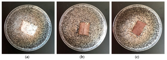 The sample antimicrobial activity tests against Chaetomium globosum. Inhibition properties of fungal growth on Petri dishes: (a)—PLA, (b)—PLA–Cu0(10); (c)—PLA–Cu0(30).