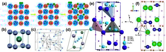 The Zr–H (8e) bond length of ZrCoH3 plays a key role in the anti-disproportionation process; the longer the distance of Zr–H (8e), the stronger the inhibition of hydrogen disproportionation can become [47,48,58,60,96]. This can also be seen from the simulation results shown in Figure 5c,e. The length of the Zr–H (8e) bond in the Zr-substituted ZrCoH3 is longer than that in the undoped ZrCoH3, whereas the length of the Zr–H (8e) bond in the Co-substituted ZrCoH3 is shorter than that in the undoped ZrCoH3 [60].