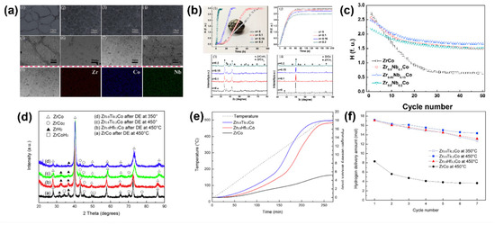 - Yao, Z.; Xiao, X.; Liang, Z.; Kou, H.; Luo, W.; Chen, C.; Jiang, L.; Chen, L. Improvement on the kinetic and thermodynamic characteristics of Zr1-xNbxCo (x = 0–0.2) alloys for hydrogen isotope storage and delivery. J. Alloys Compd. 2019, 784, 1062–1070. [Google Scholar] [CrossRef]