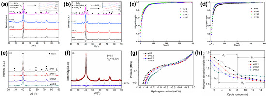 (a) XRD patterns of Zr0.8Ti0.2Co1–xFex (x = 0–0.3) alloys after arc melting; (b) XRD patterns of Zr0.8Ti0.2Co1–xFex (x = 0–0.3) alloys after 5 hydrogen absorption–desorption cycles; (c) the second hydriding kinetic curve of Zr0.8Ti0.2Co1–xFex (x = 0–0.3) alloys at 573 K; (d) the fifth hydriding kinetic curve of Zr0.8Ti0.2Co1–xFex (x = 0–0.3) alloys at 573 K [75]; (e) XRD patterns of Zr0.8Ti0.2Co1–xNix (x = 0–0.3) alloys; (f) XRD pattern and Rietveld analysis pattern of Zr0.8Ti0.2Co0.7Ni0.3; (g) desorption Pressure-composition-temperature (PCT) curves for Zr0.8Ti0.2Co1–xNix–H2 (x = 0–0.3) systems at 673 K; (h) cyclic stability curve of the Zr0.8Ti0.2Co1–xNix alloy at 573 K [77].