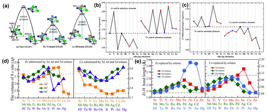 (a) Schematic diagram of H diffusion from the 8e site to the 4c2 site in undoped, Ti-doped, and Hf-doped ZrCoH3; (b) sizes of the 8e site in the undoped and doped ZrCoH3 crystal; (c) the Zr–H (8e) bond length in the tetrahedron of undoped and doped ZrCoH3 with the 8e site occupied by a H atom [60]; (d) volumes of the tetrahedron when one of the Zr/Co atoms in the tetrahedron is substituted by 3d, 4d, and 5d transition alloying solutes; (e) the bond lengths of Zr and H at the 8e site (at the center of the tetrahedron) when one of the Zr/Co atoms in the tetrahedron is substituted by 3d, 4d, and 5d transition alloying solutes [95].