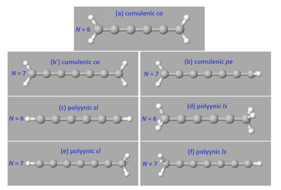 In Figure 1, we illustrate cumulenic and polyynic carbynes made of 6 and 7 carbon atoms. For N even, the cumulene with lower ground state energy is that with coplanar methylene groups, cumulenic co, shown in (a). For N odd, the cumulene with lower ground state energy is that with perpendicular methylene groups, cumulenic pe, shown in (b). For N even, placing initially the CH2– groups in perpendicular configuration and then optimizing hydrogen atoms, results in CH2– groups in coplanar configuration. Therefore, for N even, we only include cumulenic co molecules in our RT-TDDFT simulations. For N odd (even), the ground-state molecule is that with perpendicular (coplanar) end groups [23]. Polyynic ls molecules exist with eclipsed and staggered methyl groups for N even, with negligibly different ground state energy; in panel (d) we show the staggered configuration.