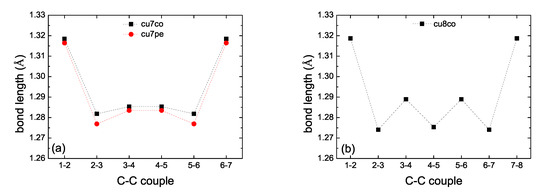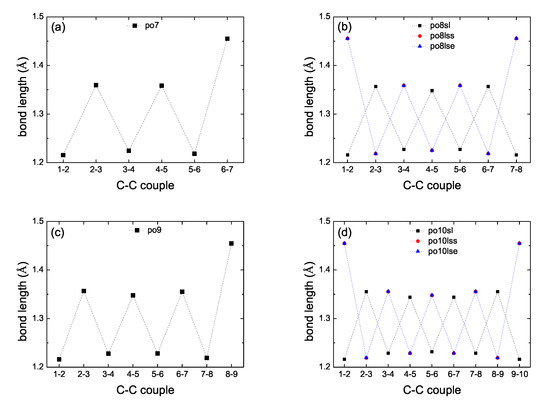 Here we would like to mention again [17] that, as has been argued, Peierls distortion [27], due to electron phonon-coupling [28], energetically favors the polyynic configuration [8,18]. Nevertheless, it has been reported, theoretically [29] and experimentally [3], that under no strain, the cumulenic phase is also possible. This has been attributed to the elimination of the Peierls distortion by the zero-point atomic vibrations [29]. Moreover, capping a finite carbyne chain between -conjugated end groups with a small number of aromatic units enhances its cumulenic character [7]. As far as we know, DFT does not include an electron phonon-coupling term, hence, although our geometry optimization results and the relevant discussion above are very interesting, we are not certain what the actual situation finally is. Hence, unless otherwise stated, in our Results Section 5 we refer to (i) “ideal cumulenic cases” with BLA , i.e., constant distance d between carbon atoms, and (ii) “ideal polyynic cases” with BLA , i.e., with alternating long and short distances, where all are constant and all are constant, but . Specifically, we take 128.2 pm for the “ideal cumulenic molecules” and 130.1 pm, 126.5 pm for the “ideal polyynic molecules”, respectively, following Ref. [22].