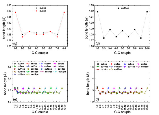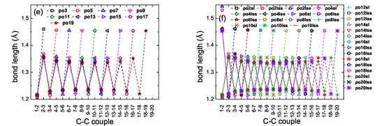 In the present work we performed full geometry optimization of all carbynes, i.e., without keeping fixed the C atoms. For cumulenic carbynes, again, this resulted in two geometries (co and pe) for N odd, but only in one geometry (co) for N even. Figure 2 shows bond lengths of various cumulenic molecules. The resulting geometries in all cases have longer C–C bonds at the ends (≈132 pm) and C-C bond lengths ≈127 to 129 pm at the middle with alternating longer and shorter bonds. Therefore, the resulting geometry is not strictly cumulenic in the sense that BLA and is not constant. However, BLA is symmetrical relative to the molecule center. In Figure 2 panels (a) and (c) we observe that for N odd, pe molecules have shorter bond lengths, another manifestation that their ground state energy is lower than that of co molecules. For polyynic carbynes, geometry optimization again resulted in one geometry, sl ≡ ls, for N odd, but to three geometries for N even: sl, lss and lse, the last two denote staggered and eclipsed methyl end groups (the difference between the ground state energy of these last two geometries is almost negligible). Figure 3 shows bond lengths of various polyynic molecules. We observe that the long bonds at the ends are longer than the long bonds at the middle of the molecules. Although Figure 2 panels (e) and (f) and Figure 3 panels (e) and (f) are dense, they certainly show the size of bond length variations in all cumulenic and polyynic cases. If we compare Figure 2 with Figure 3, we realize that BLA in cumulenic cases is much smaller than in polyynic cases, so, although not strictly, the separation to cumulenes and polyynes approximately holds.