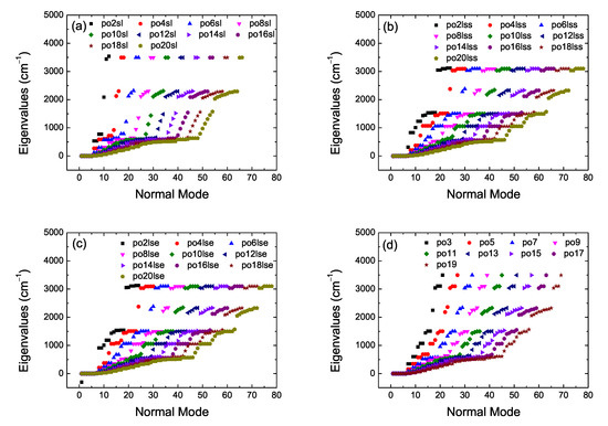 Let n be the number of atoms and N the number of carbon atoms (e.g., in cumulenes ). The number of modes, , from which 3 are translational modes, and linear (nonlinear) molecules have 2 (3) rotational modes, therefore, the number of vibrational modes is (). In Table 2 we summarize the situation for our categories. Performing vibrational analysis at the B3LYP/6-31G* level of theory results in all co geometries for N even being stable and all pe geometries for N odd being stable, as expected. It seems that also some co cumulenes for N odd are stable, but, more basis sets might need to be used before coming to a definitive conclusion about this issue. In Figure 4 we present vibrational analysis of cumulenic molecules at the B3LYP/6-31G* level of theory, without any constraint on the position of atoms. We observe the four higher frequencies corresponding to the four hydrogen atoms of cumulenes and that even N co and odd N pe cumulenic molecules are stable from the point of view of vibrational analysis. In Figure 5 we present vibrational analysis of polyynic molecules at the B3LYP/6-31G* level of theory, without any constraint on the position of atoms. We observe the two (a), six (b), six (c) and 4 (d) higher frequencies corresponding to the number of hydrogen atoms of polyynes for even N sl, even N lss, even N lse, and odd N molecules, respectively. Actually, in case (d) we can discern the two different end groups CH– and CH3–. The negative values in panel Figure 4a for the molecule with coplanar methylene groups and in panel Figure 5c for the ls molecule with eclipsed methyl groups are associated with imaginary eigenfrequencies. As explained in Ref. [26]: “If you have optimized to a transition state, or to a higher order saddle point, then there will be some negative frequencies which may be listed before the “zero frequency” modes. (Frequencies which are printed out as negative are really imaginary; the minus sign is simply a flag to indicate that this is an imaginary frequency)”.