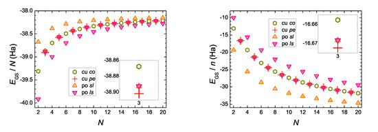 “Ground state” energy, , of molecules with a hole created at its first site, B3LYP/cc-pVTZ level of theory. N is the number of carbon atoms, n is the number of all atoms, cu co and cu pe denote cumulenic molecules with coplanar and perpendicular methylene groups, respectively; po sl and po ls denote polyynic molecules starting with short and long bonds, respectively. The insets emphasize that, for odd N, the cu pe and cu co molecules come closer in energy (it seems that for cu co has slightly lower energy), po sl has higher energy and po ls still higher.