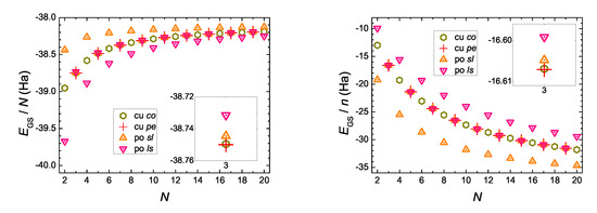 In Figure 6 we present the ground-state energy, , of neutral molecules at the B3LYP/cc-pVTZ level of theory. We observe that are increasing functions of N, while are decreasing functions of N. For even N, there are big differences between polyynic sl, cumulenic co and polyynic ls molecules, the cumulenic co is always in the middle, while, the order of polyynic molecules changes if we consider instead of . For odd N, the of all molecules are much closer than for even N. For odd N, the cumulenic pe molecule, which exists only for odd N, is, in fact, the molecule with the lowest , while the cumulenic co version is the molecule with the highest (cf. Figure 6 insets).