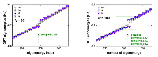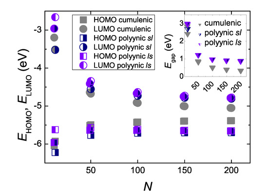 In Figure 8 we give an example, for and , where we observe the formation of an energy gap between occupied and empty eigenstates of neutral molecules, at the B3LYP/cc-pVTZ level of theory. For , the cumulenic co molecule does not show an energy gap, but the cumulenic molecule with the lowest ground state energy, i.e., the cumulenic pe molecule, does. The conclusion is that cumulenes also have an energy gap, albeit smaller than polyynes. The evolution of the eigenenergies of the Highest Occupied Molecular Orbital (HOMO), , the Lowest Unoccupied Molecular Orbital (LUMO), , and of the energy gap between them, , for cumulenes and polyynes, increasing N, are illustrated in Figure 9. Increasing N, the energy gap approaches ≈ 0.3 eV for cumulenes and ≈ 0.9 eV for polyynes.