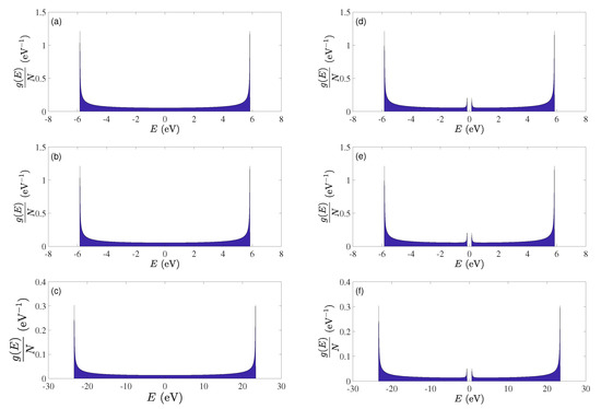 Density of states, , per number of carbon atoms, N, for the three Tight-Binding (TB) variants used in this work. (a) cumulenic TBI, (b) cumulenic TBImod, (c) cumulenic TBImodt4times, (d) polyynic TBI, (e) polyynic TBImod, (f) polyynic TBImodt4times.