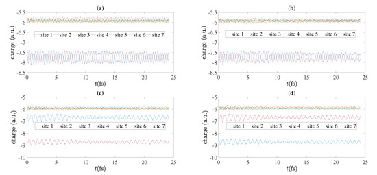 Charge oscillations obtained by RT-TDDFT, at the B3LYP/cc-pVTZ level of theory, , for cumulenic (cu) molecules with coplanar (co) and perpendicular (pe) methylene groups as well as polyynic (po) molecules starting with short (sl) or long (ls) bonds. (a) cu co, (b) cu pe, (c) po sl, (d) po ls.