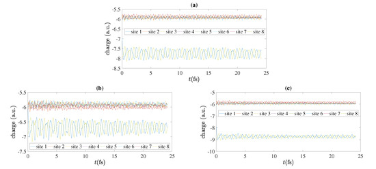 which is equal to . We have used the Harrison expressions [31,32] and taken into account the orientation of the constituent atomic orbitals. For each of the two channels made of and orbitals, respectively, the transfer integral between two consecutive sites i and j would be . These channels occur at a higher energy compared to the previous channel, that is , hence they will somehow have a higher weight relative to the channel, whereas, if we add up all these contributions we get , which is very close to , the necessary transfer integral between intermediate sites to bring the TB wire results very close to the RT-TDDFT results in terms of frequency content of charge and dipole moment oscillations as well as in terms of coherent transfer rates.