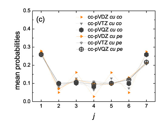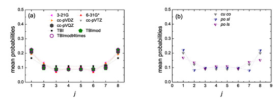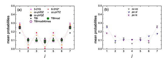 In Figure 14 and Figure 15 we present the mean over time probabilities to find the hole at each site j, having placed it initially at the first site, for open cumulenic and polyynic carbynes, for 7 and 8, respectively. The results shown were calculated by RT-TDDFT, using the basis sets 3–21 G, 6–31 G*, cc-pVDZ, cc-pVTZ, cc-pVQZ and the functional B3LYP. We also show the TBI, TBImod, TBImodt4times results, for comparison. We compare cumulenic (cu) molecules with coplanar (co) or perpendicular (pe) methylene groups as well as polyynic (po) molecules starting with short (sl) or long (ls) bonds. Increasing the size of the basis set, we observe the clear convergence of the RT-TDDFT results as well as the convergence of the RT-TDDFT results with the TB variants, increasing the level of TB elaboration. Finally, we observe the little differences in site occupations between cu co, cu pe, po sl, po ls molecules. A short discussion about these differences can be found in Ref. [17].