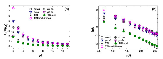 Here is the mean transfer time, i.e., the necessary time for the probability to find the extra carrier at site , , to become equal to its mean value, , for the first time, having placed at time zero the carrier at site . Defined this way, k evaluates the magnitude of charge transfer and the time scale of the phenomenon. A comparison of and for initial hole placement at the first site and up to the last site (), as obtained by RT-TDDFT at the B3LYP/cc-pVTZ level of theory as well as by the TB variants TBI, TBImod, TBImodt4times, is shown in Figure 16. Although RT-TDDFT is followed by TBI and –slightly better– TBImod in a parallel natural logarithmic manner, the two latter cannot reproduce quantitatively the fast dynamics of RT-TDDFT. However, the transfer rates obtained by TBImodt4times follow closely the transfer rates obtained by RT-TDDFT. A discussion and comparison of the transfer rates of cumulenic vs. polyynic carbynes, obtained by RT-TDDFT, can be found in Ref. [17].