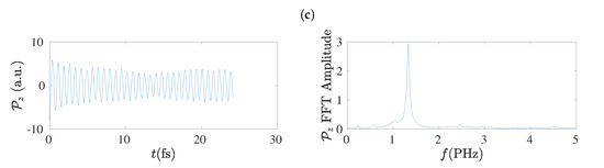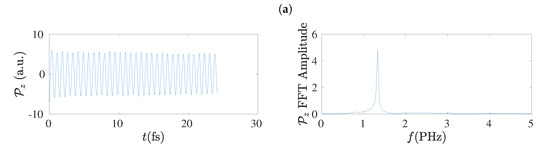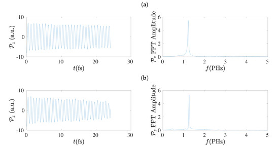 The electric dipole moment, , has the advantage of being independent on the population (charge) analysis. Therefore, it can be used to extract the frequency content of hole oscillations [17] without concern that charge analysis might have some influence. In the left columns of Figure 17 and Figure 18 we give examples of the electric dipole moment oscillations along the z-axis, for molecules with and , respectively, obtained by RT-TDDFT at the B3LYP/cc-pVTZ level of theory. In these figures we omit dipole moment oscillations along the x-axis and the y-axis, because their maximum values are of the order of to a.u. for cumulenes (both end groups CH2–) and even N sl polyynes (both end groups CH–), and of the order of 0.1 a.u. for other polyynes. In the right columns of Figure 17 and Figure 18 we present the corresponding FFT of each , as obtained simply by MATLAB, without any further elaboration. The time step in RT-TDDFT was 0.5 a.u.; we covered 1000 a.u. ≈ 25 fs with ≈ 2000 points.