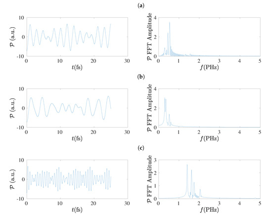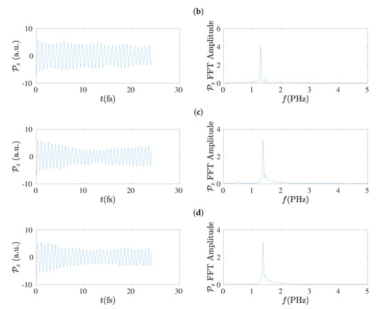 In the left columns of Figure 19 and Figure 20 we present the dipole moment () oscillations as obtained by the TB variants TBI, TBImod and TBImodt4times, for molecules with and , respectively, and in their right columns the corresponding FFT of each , as obtained simply by MATLAB, again without any further elaboration. The number of points in the TB simulations for the duration of 25 fs is 128 × 16,385. The main conclusion from these figures is that TBI and TBImod produce dipole moment oscillations not fast enough to compete with RT-TDDFT. However, TBImodt4times dipole moment oscillations have similar frequency content with RT-TDDFT.