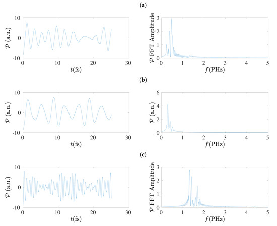 Left column: Dipole moment oscillations along the z-axis, , obtained by RT-TDDFT at the B3LYP/cc-pVTZ level of theory, for , for cumulenic (cu) molecules with coplanar (co) methylene groups as well as for polyynic (po) molecules starting with short (sl) or long (ls) bonds. Right column: The corresponding FFT amplitudes obtained by MATLAB without any further elaboration. (a) cu co, (b) po sl, (c) po ls.