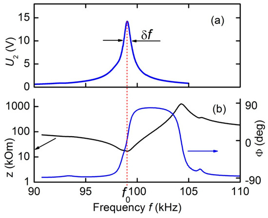 Figure 2a shows a typical measured amplitude-frequency response of a transformer with an input voltage U1 =1 V and a constant magnetic field of H = 6.37 kA/m for the open-circuit condition (at RL = ∞). One resonance peak around the frequency f0 ≈ 99.02 kHz was observed in the frequency response. The resonance quality factor was estimated from the width of the resonance curve δf at a height of 0.707: Q = f0/δf ≈ 143. The voltage transformation ratio at the resonance frequency is K = U2/U1 = 14.1. Figure 2b presents the measured dependence of the output impedance magnitude Z and its phase Φ on the frequency of the input voltage. The minimum impedance value Z = R2 ≈ 17.7 kΩ was observed near the frequency f0. The voltage phase near the resonance frequency, as can be seen, changes by 180°.