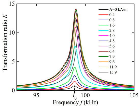 Dependences of the voltage transformation ratio K on the frequency f for different control fields H (0–15.9 kA/m) under open-circuit condition.