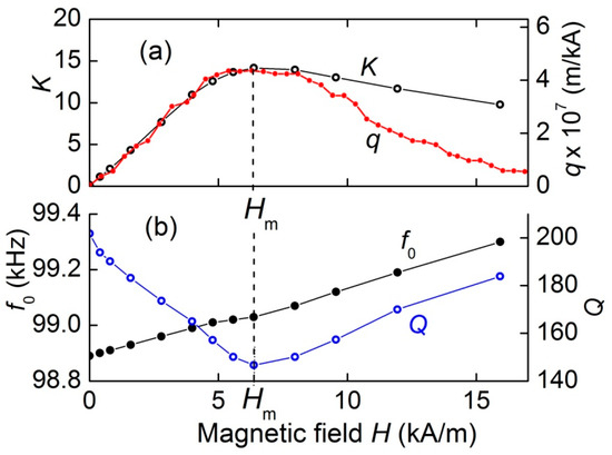 To confirm this conclusion, the field dependence of magnetostriction λ(H) was measured by a strain gauge glued to the surface of the ferrite layer. Then, using the numerical differentiation, the field dependence of the piezomagnetic coefficient q(H) was found. The obtained dependence q(H) is shown in Figure 4a. For convenience of comparison, the scale along the vertical axis for q is chosen so, that the maxima of the dependences K(H) and q(H) visually coincide. It can be seen that the piezomagnetic coefficient q initially linearly increases with increasing field H, reaches a maximum at the same characteristic field Hm ≈ 6.37 kA/m, and then decreases as the ferrite layer is saturated. The shapes of the field dependences K(H) and q(H) agree qualitatively well. The discrepancy between the curves in the region of large fields can be due to the influence of the Poisson’s effect and the inhomogeneity of the magnetic field inside the FM plates due to the demagnetizing fields, which were not taken into account in the calculations. The dependence of the resonance frequency f0 and the quality factor Q of the structure on the field H (Figure 4b) is caused by the dependence of the Young's modulus and the mechanical losses of the ferrite layer on the magnetic field H, as observed previously [15].