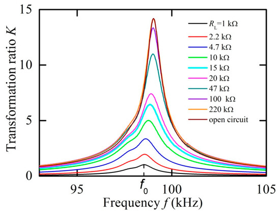 Next, the characteristics of the transformer were measured in dependence on the load resistance. Figure 5 shows the dependence of the transformation ratio K on the frequency of the input voltage for different load resistances RL = 0–220 kΩ. The measurements were carried out in the optimal bias field Hm = 6.37 kA/m and an input voltage amplitude of U1 = 1 V. It can be seen that the transformation ratio is highly dependent on the load, while the resonance frequency and the quality factor of the resonance change slightly.