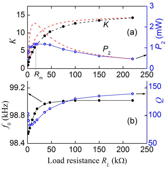 Figure 6 presents the dependences of the transformation ratio K, output power P2, frequency f0, and Q-factor of resonance on the load resistance RL constructed from the data in Figure 5. It can be seen that the transformation ratio increases monotonically from zero to 14.1 with the load resistance increasing up to RL = 220 kΩ. In this case, the output power P2 varies non-monotonically: first it increases from zero and reaches a maximum Pm ≈ 1.18 mW with a load resistance of Rm ≈ 18–20 kΩ, and then monotonously decreases to P2 ≈ 0.9 mW with a further increase in resistance to RL = 220 kΩ. A similar type of dependence was observed earlier in [17]. In this case, the resonance frequency f0 monotonously increases by less than 0.5%, from 98.54 to 99.02 kHz with the increasing load. The resonance quality factor Q first steeply decreases with the increasing load resistance from Q ≈ 100 to Q ≈ 80 at RL ≈ 5 kΩ, and then again increases to Q ≈ 142 at high load resistances.