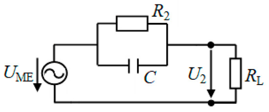 To explain the dependences presented in Figure 6a, we use a simplified equivalent circuit for the capacitive part of the transformer as shown in Figure 7. The output circuit is an ac voltage source with an open-circuit voltage amplitude UME and the internal impedance represented by a lossy capacitor (C, R2). The output circuit is loaded by resistance RL.