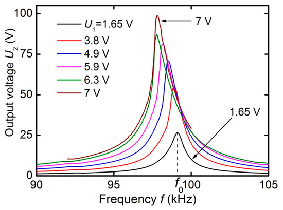 Figure 8 presents the dependences of the output voltage of transformer U2 on the frequency of the input voltage at different amplitudes U1 under open-circuit condition with Hm = 6.37 kA/m. It can be seen that the output voltage U2 increases with increasing input voltage U1, while the line shape is distorted, and the center frequency f0 is slightly shifted towards lower frequencies. The relative shift of the resonant frequency did not exceed 1%. A downward frequency shift with increasing U1 was previously observed in ME resonators. It is caused by a change in the rigidity of the FM layer of the structure under an alternating magnetic field [18].