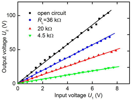Figure 9 shows the dependences of the amplitude of the output voltage U2 at the resonance frequency on the input voltage U1 for various load resistances RL, constructed using the data similar to those in Figure 8. The dependences U2(U1) are linear with high accuracy in the input voltage range up to 8 V. The slope of the lines, i.e., the voltage transformation ratio K = U2/U1, depends on the load value RL, in accordance with the data in Figure 6a. Similar linear dependences, but with smaller transmission coefficients, were observed under different external magnetic fields.