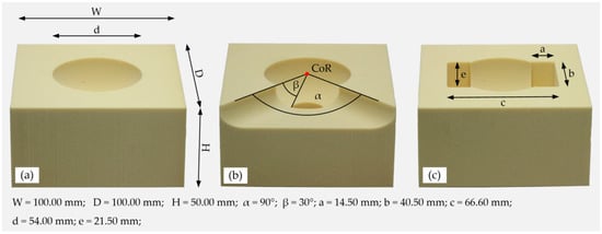For the experimental investigation of the influence of the tilting method on the primary stability of a cementless acetabular cup, a biomechanical cup-block model was used. For this purpose, polyurethane (PU) foam blocks (Sawbones®, Malmö, Sweden) with densities of 15 pcf (0.24 g/cm3, E = 173 MPa) and 30 pcf (0.48 g/cm3, E = 592 MPa) were used as artificial bone materials to represent the acetabular cavity. Three types of cavities were considered for the tests: the intact cavity (Intact), a moderate superior acetabular defect (Defect 1), according to our previous study [], and a two-point pinching cavity model (Defect 2), according to Jin et al. [] (Figure 1). Defect 1 (D1) represents a superior acetabular defect in which 50% (α = 90°) of the superior acetabular rim (defect width) and 33% (β = 30°) of the mediolateral wall (defect depth) are lost. This defect was identified as the maximum defect extent to which the anchoring of a primary acetabular cup seems to be possible []. Furthermore, the cavity of Defect 2 (D2) was adapted to the shape of the acetabular cup, according to Meding et al. []. The two-point pinching model was assumed to be the worst case of clamping of an acetabular cup in terms of implant deformation and is therefore often used [,]. Three identical blocks (n = 3) were manufactured by means of computer numerically controlled (CNC) milling for every combination of foam density and defect type. The cavities with an inside diameter of 54 mm were chosen according to the surgical technique of the utilized acetabular cup, which resulted in a nominal diametric press-fit of 2 mm. For the tests, the Allofit® press-fit cup (54/JJ, Zimmer Inc., Warsaw, IN, USA) with a nominal outer diameter of 56 mm was used.