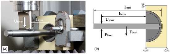 Test method 1—Displacement-controlled lever-out test. (a) Experimental test setup for the lever-out test. (b) A schematic view of the lever-out test. The parameters required calculating the lever-out moment—the effective lever arm length (llever), the applied displacement (Ulever), and the measured ultimate lever-out force (Flever) have been shown. The intrinsic moment resulting from the parameters—the deadweight of the lever shaft (Fdead) and the total length of the lever shaft (ltotal)—were also taken into account (Formula (1)).