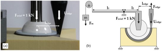 Test Method 2. (a) Experimental test setup for the displacement-controlled edge load test. (b) A schematic view of the edge-load test. By means of a lever construction (l1 and l2) in combination with a deflection roller, the weight (Fm) of the mass (m) introduced an axial force Faxial = 1 kN into the liner of the acetabular cup. The tangential displacement of the cup edge (Uedge) to the implant–block interface counteracted the resistance moment (Medge). The moment (Medge) resulted from the distance between the axial force (Faxial) and the reaction force (Fedge), which counteracted the displacement of the cup edge.