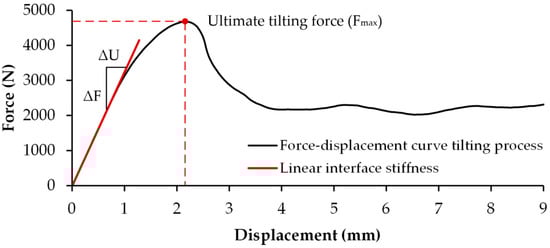 Typical force–displacement curve of the acetabular cup tilt, including the different fixation stability parameters: ultimate tilting force (Fmax) and interface stiffness (kinter = ΔF/ΔU).