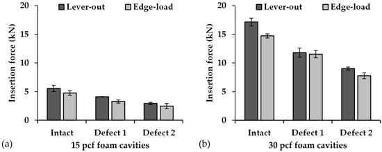 Comparison of the forces of the acetabular cup insertion for both the tilting methods: (a) for the PU foam with a density of 15 pcf and (b) for the PU foam with a density of 30 pcf. The insertion forces are presented as mean values (n = 3), and the error bars represent SD.