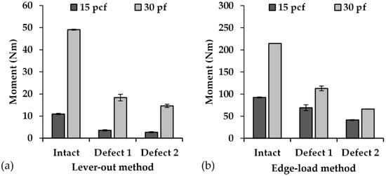 Comparisons of the determined moments of the acetabular cups with regard to the combination of cavity type and foam density for (a) the lever-out test method (Method 1) and (b) the edge-load test method (Method 2). The tilting moments are presented as mean value (n = 3), and the error bars represent the SD. The intact cavity made of 30 pcf foam density tested with Method 2 is the only exception, where only one cup could be tested. For reasons of better visibility, the scaling of both graphs was adjusted to the determined values.