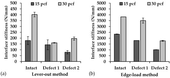 The interface stiffness determined with Method 1 reduced by about 55% with intact cavity, by about 11% with Defect 1, and by about 60% with Defect 2 when using 15 pcf foam density compared to 30 pcf foam density. Those determined with Method 2 decreased by about 39% with intact cavity, by about 49% with Defect 1, and by about 43% with Defect 2. Moreover, an increase in the defect extent from Intact to Defect 1 and from Intact to Defect 2 caused an average reduction of the interface stiffness determined with Method 1 of about 20% and 56% for the foam cavities with 15 pcf density as well as 60% and 51% for the foam cavities with 30 pcf density, respectively. When using test Method 2, the interface stiffness was reduced from Intact to Defect 1 by about 23% and from Intact to Defect 2 by about 57% for the foam cavities with 15 pcf density as well as by about 8% and 53% for the foam cavities with 30 pcf density. For the artificial bone with the same defect extent and the same density, significant differences were found between Method 1 and Method 2 for the parameter interface stiffness. The comparison between the combinations of defect type and foam density within the test methods also exhibited significance differences (Table 3).