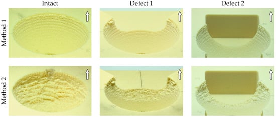 A visual comparison of the cavity surfaces after disassembling the acetabular cups from the PU foam cavities (30 pcf) with Method 1 and Method 2. The arrows in the upper right corner of the figures represent the direction of acetabular cup tilting (superior). In all the cavities tested with Method 1, clear impressions of the barb-like surface structure of the acetabular cup, caused by cup insertion, were present. The small areas where shear stress was detected were located in the direction of acetabular cup tilting (superior). In the acetabular cups tested with Method 2, extensive abrasion of the foam structure was present in the direction of acetabular cup tilting, indicating the occurrence of higher shear stress in the implant–bone interface.