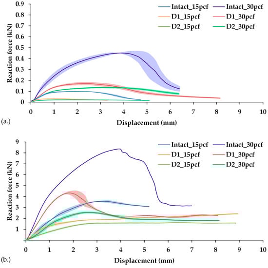 Force–displacement curves determined using Method 1 (a) and Method 2 (b) for tilting the acetabular cups from all the cavity types at 15 pcf and 30 pcf foam densities. For qualitative comparison, the curves are represented by their mean values (n = 3) for each cavity type-foam density combination, and the colored area around the curve represents the SD. The only exception in the force–displacement curves is for the intact cavity in the foam block of 30 pcf density in Method 2. Moreover, due to the occurrence of plastic deformation at the rim of the acetabular cup, only one cup could be tested. For reasons of better visibility, the scaling of both graphs was adjusted to the determined values.