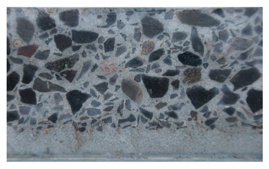 The procedure for determining the content of parts insoluble in HCl was as follows: after comminution, sieving through a 1-mm sieve, and drying to constant weight at 105 °C, the samples were sieved through a 0.2-mm sieve. Samples of about 2 g were tested using an aqueous solution (1:3) of hydrochloric acid (HCl) to determine the content of insoluble parts. Each sample was placed in a 250-mL beaker and 100 mL of HCl solution was added at room temperature. The contents of the beaker were mixed and the insoluble residue was triturated with a glass rod. After 15 min, the supernatant fluid was decanted. Next, 50 mL of HCl solution was poured onto the precipitate in a beaker and placed in a water bath at 90 °C for 15 min. Then, the contents of the beaker were washed twice with hot water and decanted. The precipitate remaining in the beaker was flooded with 50 mL of 5% Na2CO3 and placed in a water bath at 90 °C for 15 min, before being washed twice with hot water and decanted. The remaining precipitate was flooded with 50 mL of water, acidified with HCl (1:3) against methyl orange, while adding an excess of 3–4 drops of acid to the neutralized solution, after which the contents of the beaker were filtered. The filtered precipitate was washed six times with hot water until the reaction due to chlorides ceased. The washed precipitate was transferred to a weighed porcelain crucible and, after burning, the filter was calcined at 1000 °C to finally determine the mass of parts insoluble in HCl. Typically, it is assumed that the aggregate mass in the tested sample is equal to the mass of parts insoluble in HCl determined as a result of the analysis. However, when determining the aggregate content in this study, a preliminary analysis was performed to determine the aggregate behavior under the influence of hydrochloric acid. It turned out that basalt in the form of aggregate is resistant to HCl acid, while, after being pulverized, it dissolved partly in hydrochloric acid. Probably weathered basalt was used for concrete in some parts of the aggregate 8–11 mm (Table 1) []. Thus, when determining the aggregate content, account was taken of the presence of HCl-soluble parts in the aggregate, by introducing the appropriate correction. Finally, the aggregate mass percentage was calculated as