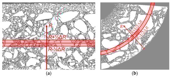 On the basis of the analyses carried out, selected morphological statistical measures were determined: component volume fraction and so-called local thickness. The average volume fraction of the selected component is defined as the number of pixels in the component divided by the total number of pixels (in a selected area of the image). To describe the variability of the volume of the component as a function of R, a series of image subareas was selected, which are narrow circumferential bands of the concrete pole wall. The volume fraction ϕ(R) (dependent on coordinate R) is calculated in the band with the center line corresponding to coordinate R and the width ΔR. The method of selecting the aforementioned band is shown in Figure 4a. It is worth mentioning that, in the case of cross-section analysis as in [], the shape of the band is annular (see Figure 4b).