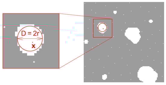 Local structure thickness is a scalar field, defined only in the area occupied by the considered constituent. The procedure for determining the local element thickness generally consists of filling the area occupied by the considered constituent with circles of the largest possible diameter []. Then, the thickness of the element at a given point x is defined as the largest diameter of the circle, which entirely fits within the constituent under consideration and, at the same time, contains point x in its interior. This is schematically illustrated in Figure 5.