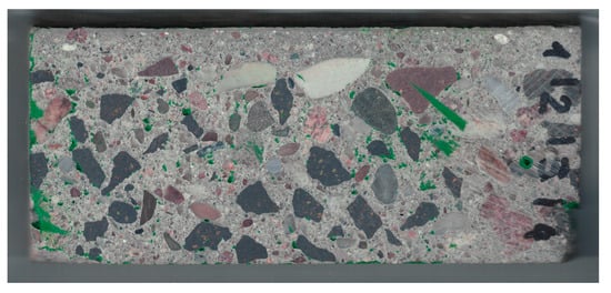 Staining the pores first and then the matrix (with a different color), after etching it with acid, allowed quantifying the morphology of the following components: air voids (macro-pores), cement matrix, and aggregate. Thus, the scope of analyses was expanded compared to the analysis presented in [], where only aggregate morphology was described. To perform calculations as a part of the analysis of the morphology of individual components, the author’s own procedure written in the Mathematica program was used. Selected image transformations were carried out in GIMP, ImageJ (Fiji distribution), and CTAn programs.
