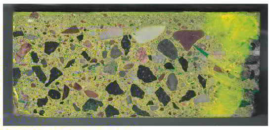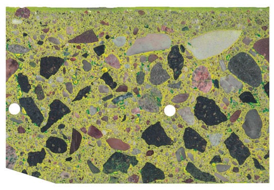 To enable comparison of scans at individual stages of staining, all images were superimposed and matched to each other by appropriate rotation and shift. The pictures presented below show already “matching” images, for which the dimensions in pixels are the same and the position of the analyzed sample is the same. To exclude the background from the analysis, as well as inadequately polished fragments, edges jagged during cutting, and reinforcing bars, further analysis focused on the area of the image showing the correctly prepared surface of the concrete sample. This area is called the region of interest (ROI). The complement of ROI was not included in the analysis. For this part of the image, a white mask was applied. The image of the stained sample, limited by the aforementioned mask to ROI, is presented in Figure 9. By using ROI, most of the polishing marks, which were stained as pores, were eliminated from the analysis.