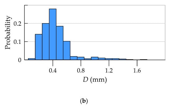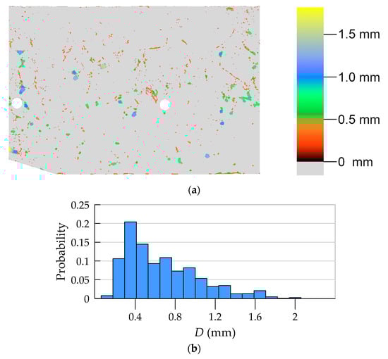 In general, all three methods used in the study allow determining porosity. The undoubted advantage of methods based on image analysis is the possibility of obtaining a virtually continuous function of porosity distribution, which in qualitative assessment (whether porosity changes as a function of the element thickness and what is the course of this variability) is very important. In addition, these methods make it possible to evaluate the morphology of pore space, in particular, to determine quantities such as pore width (see Figure 12) or shape parameters, e.g., sphericity. The laboratory method does not boast these advantages; in the field of assessment of porosity distribution, it allows in practice determining only the average porosity values in several arbitrarily determined layers of the element wall. In turn, the main limitation of the methods based on image analysis is linked to resolution. It is possible to obtain information only about pores larger than the pixel size (or voxel in 3D). With the test resolution used, on the order of tens of micrometers, such pores should be defined as structural macropores [,]. Obtaining any information about microporosity using methods based on image analysis requires extension of the methodology and the adoption of additional assumptions, e.g., [,]. Laboratory tests used in this work allow determining two types of porosity, i.e., total porosity and open porosity. The latter, due to the physical basis of the study (i.e., water absorption of concrete), should be primarily identified with capillary porosity. Apart from the limitations of the research methods used, they should be considered complementary to each other, i.e., giving detailed information on individual types of porosity: structural, total, and capillary (open).
