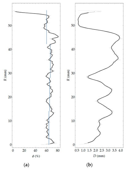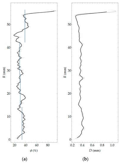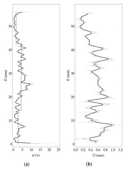 Pore segmentation was performed by subtracting images before and after staining, followed by global thresholding. The particular technique was described in more detail in previous work []. The segmentation result, i.e., the binary image of pores, is shown in Figure 10. Figure 11 shows a contour map of pore local thickness, as well as its histogram. Graphs of porosity and average pore thickness as a function of coordinate R are presented for the consideration sample in Figure 12. The brightest gray lines correspond to the width ΔR (as in Figure 4) equal to the pixel size. Darker lines correspond to greater values of adopted width ΔR. The same remark holds true throughout the remaining graphs in the paper.