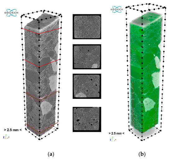 In order to describe the pore space network, a nondestructive technique, namely, µCT, was used. The sample was cut to a cuboid with dimensions allowing to obtain a test resolution of 21.40 µm/pix. Then, the prepared cuboid was fixed to the holder in the chamber of the device (Figure 17).