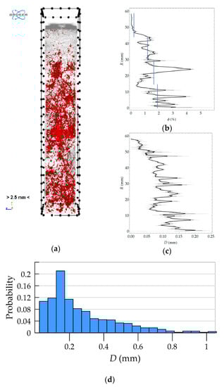 The first stage of the analysis was pore segmentation using the threshold method preceded by the use of a smoothing filter. The spatial morphology of the pores extracted in this way is shown in the perspective view in Figure 19a, in which the pores are indicated in red and the reconstruction is shown in gray, for which a high level of transparency was set. Morphometric analysis was performed on the binary image of the pore space. In particular, porosity and local pore thickness were determined. The variability of these quantities as a function of coordinate R is shown in Figure 19b,c. Figure 19d presents the histogram of pore size. The variation with R was determined in a manner analogous to that used in 2D analyses. This time, however, subsequent layers (horizontal sections) of the 3D image were treated as circumferential bands.